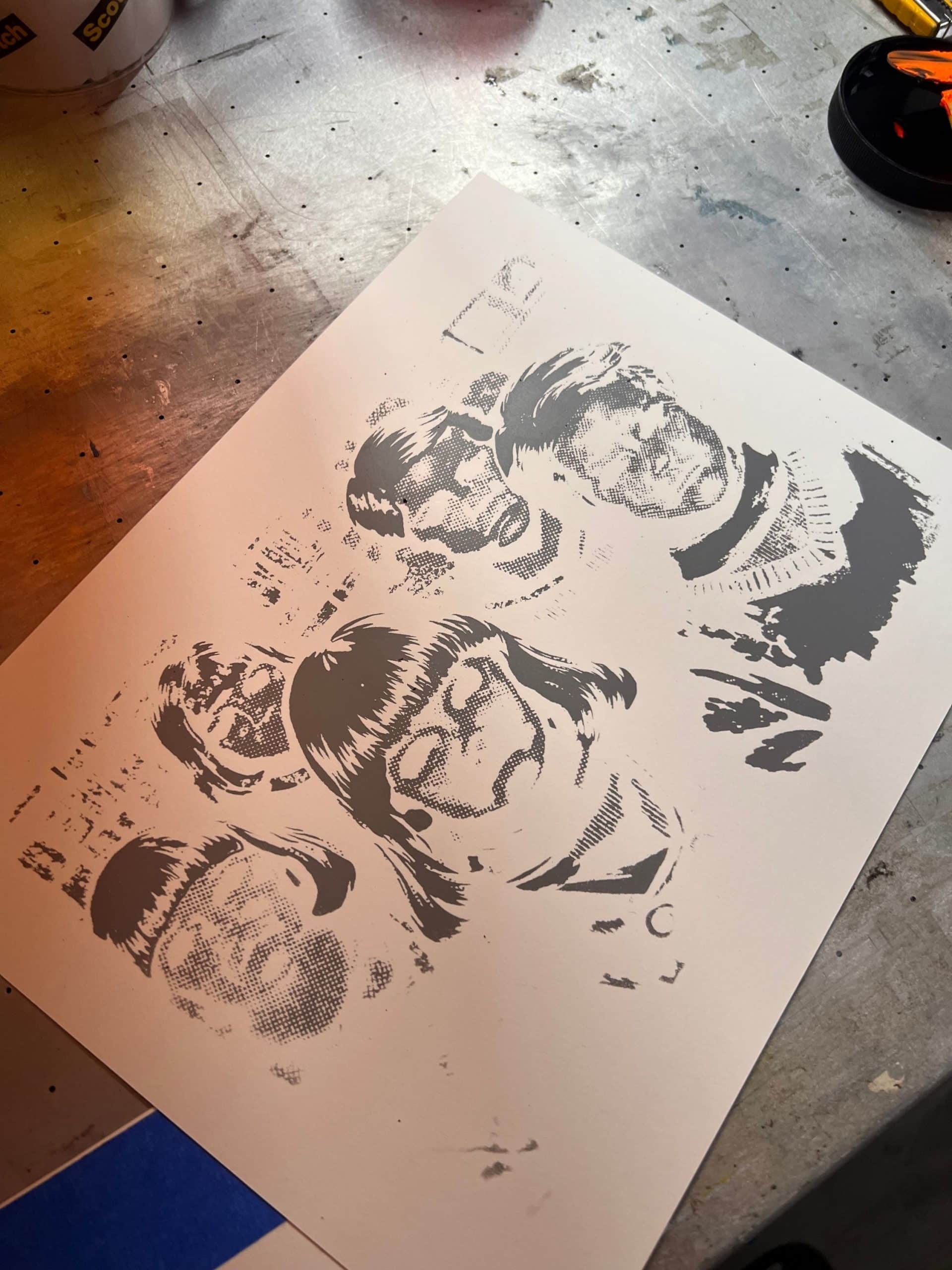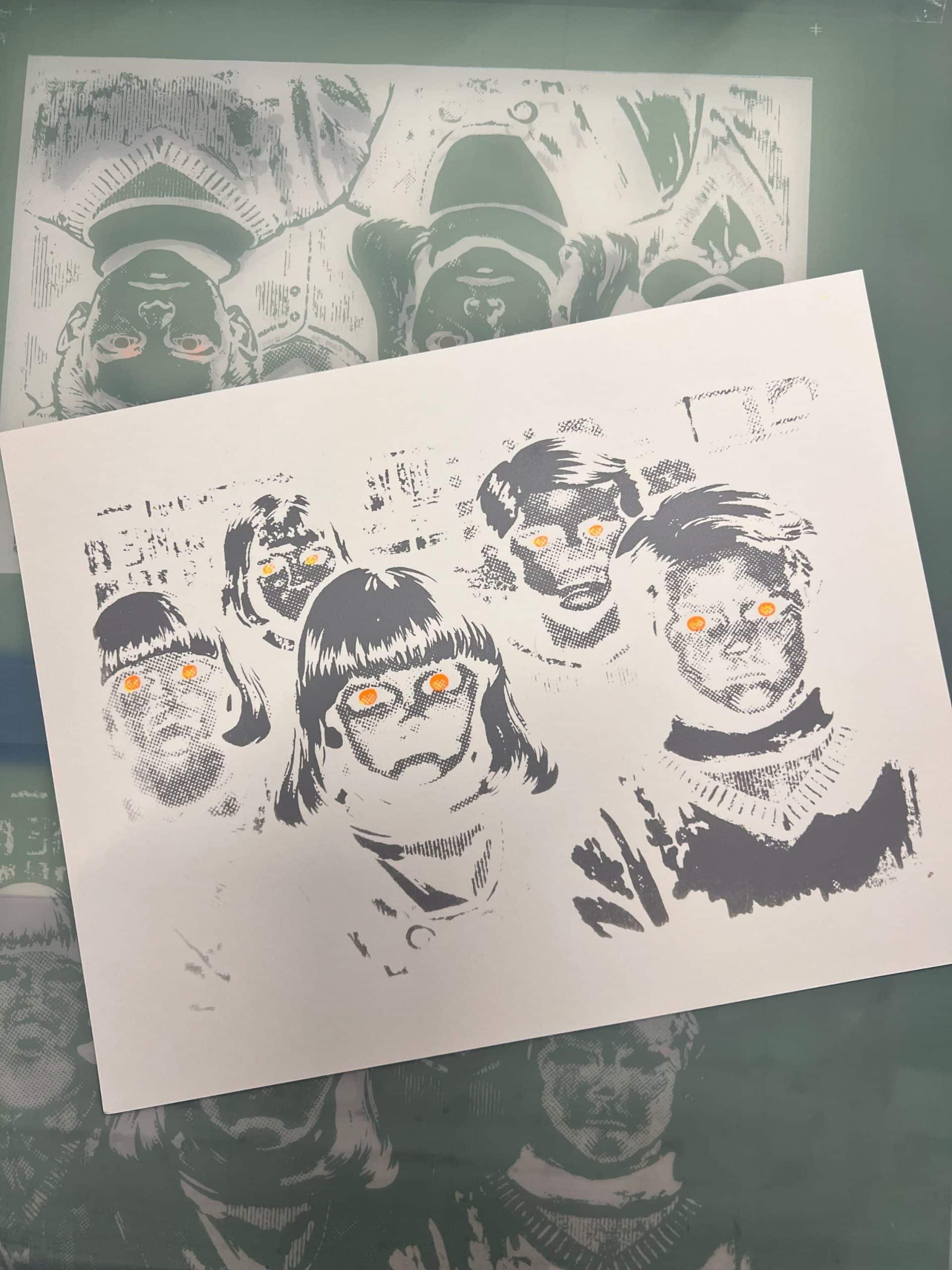 Each print is hand pulled, one color at a time, resulting in subtle variations in ink texture and alignment that make every piece unique. The second color layer adds depth and the signature glow effect, emphasizing the eyes and heightening the creepy atmosphere.