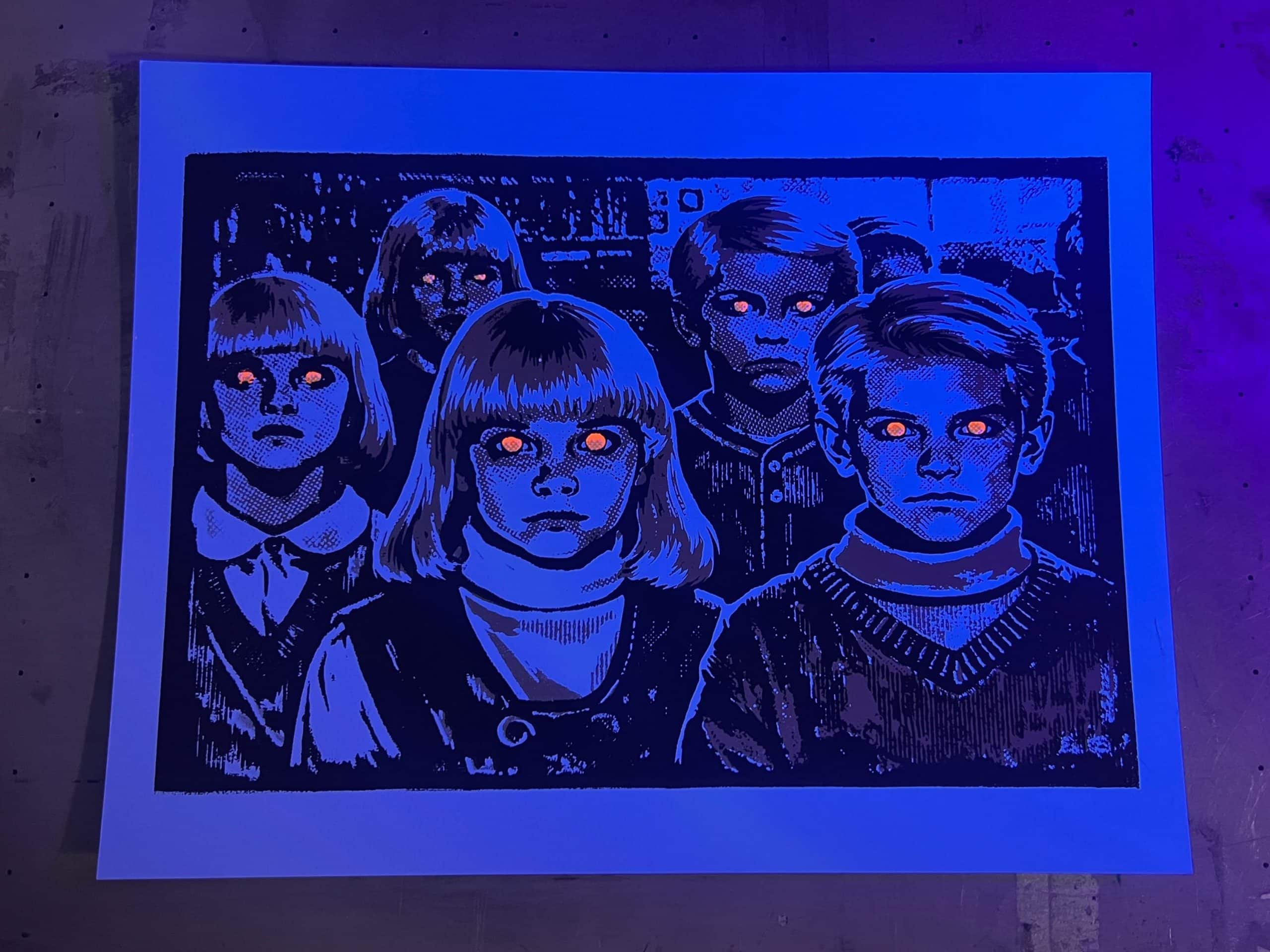 Created from an original image and translated into a bold, graphic screen print, this piece features glow-in-the-dark ink in the children’s eyes, giving the eerie illusion that they follow you once the lights go out. In daylight, it reads as striking horror wall art—at night, it comes alive.
