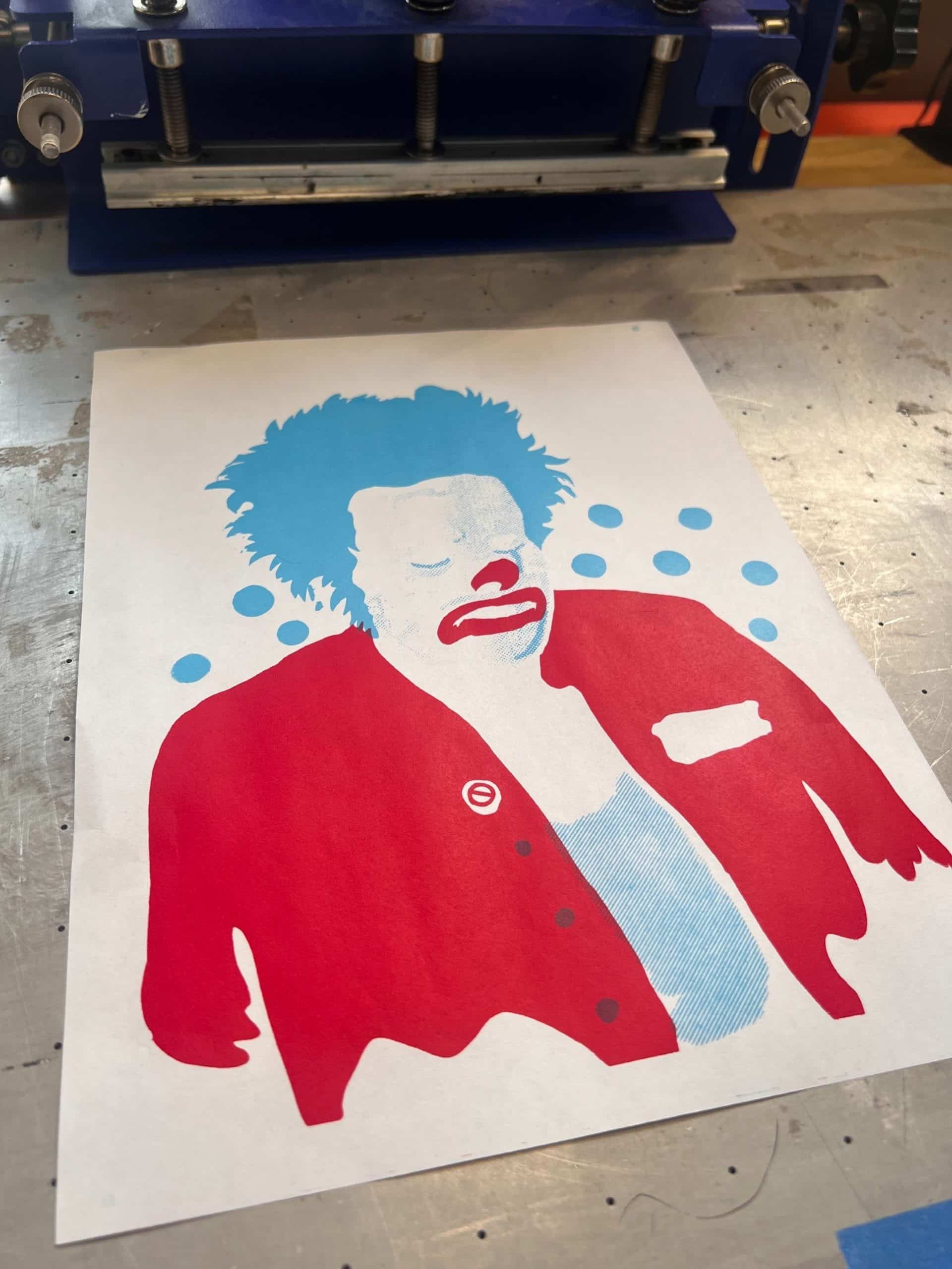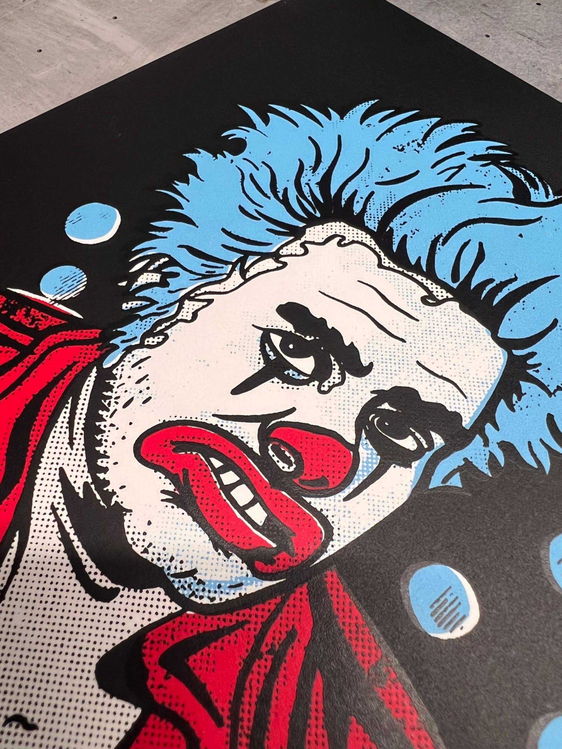 This hand screen printed artwork is inspired by Cokie the Clown, the dark and chaotic character created by Fat Mike of NOFX and embraced by punk fans worldwide.